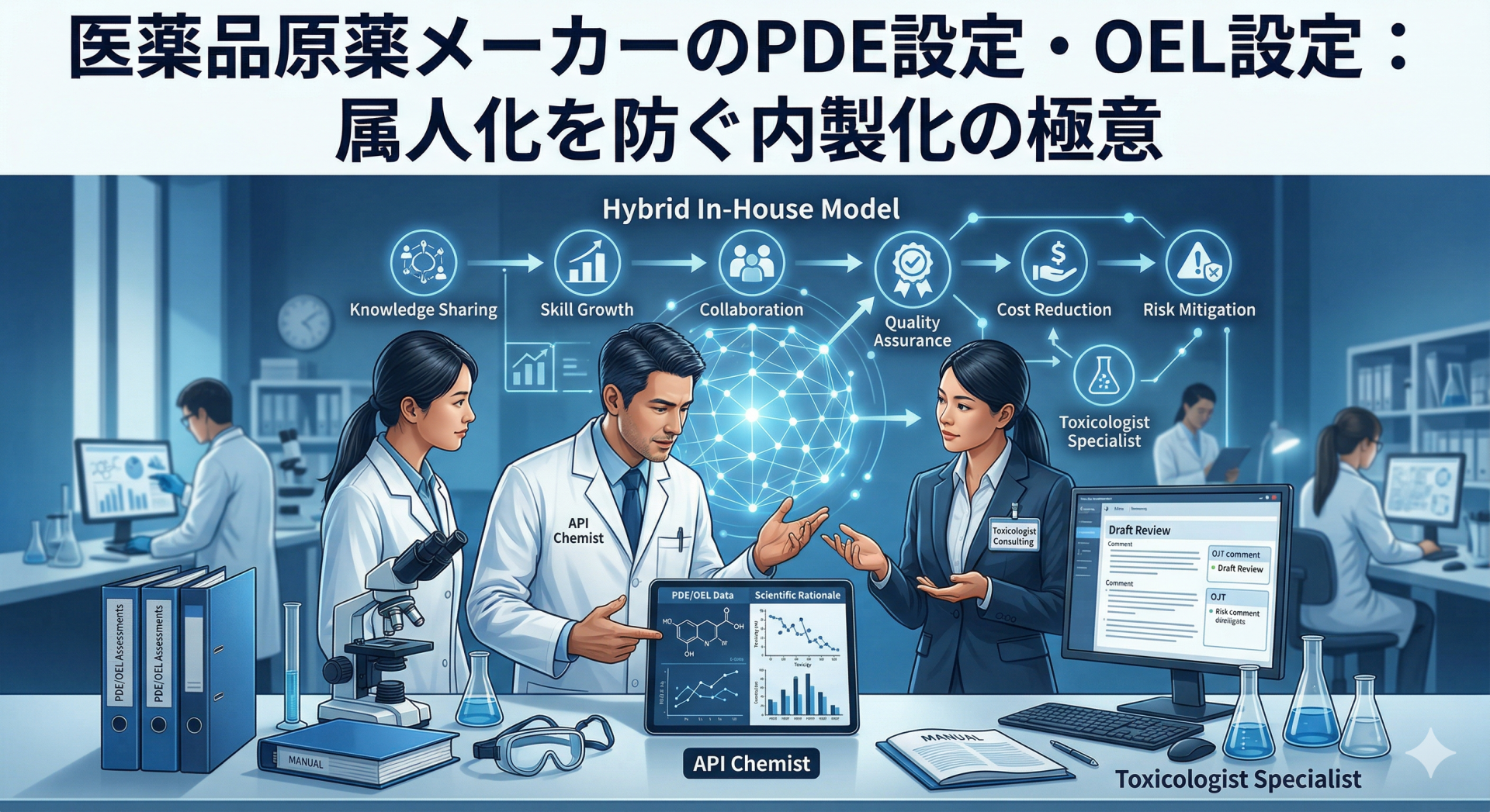 医薬品原薬メーカーを取り巻く安全性や品質に対する要求は、規制の国際調和が進む中で今後もさらに高まり続けることが予想されます。その厳しい環境の中で、PDE/OELの評価体制を場当たり的に処理するのではなく、ハイブリッド型支援を通じて自社のコアコンピタンスとしてしっかりと育て上げることは、顧客である製薬会社からの強固な信頼獲得に直結します。科学的根拠に基づいた正確で迅速なデータ提供能力は、単なる規制対応を超えて、他社との明確な差別化要因となり、原薬メーカーとしての長期的な競争力とブランド価値を生み出します。
